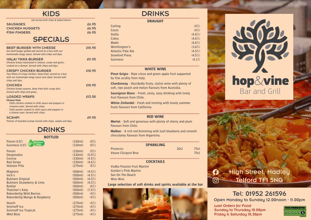 Recently refurbished, The Hop & Vine now boasts a gorgeous new extension giving our pub an airy, modern feel. We have a separate bar and dining area, both perfect for any occasion and our extensive menu courtesy of The Grill, is available whether you choose to sit in our comfy bar or fabulous new restaurant.
